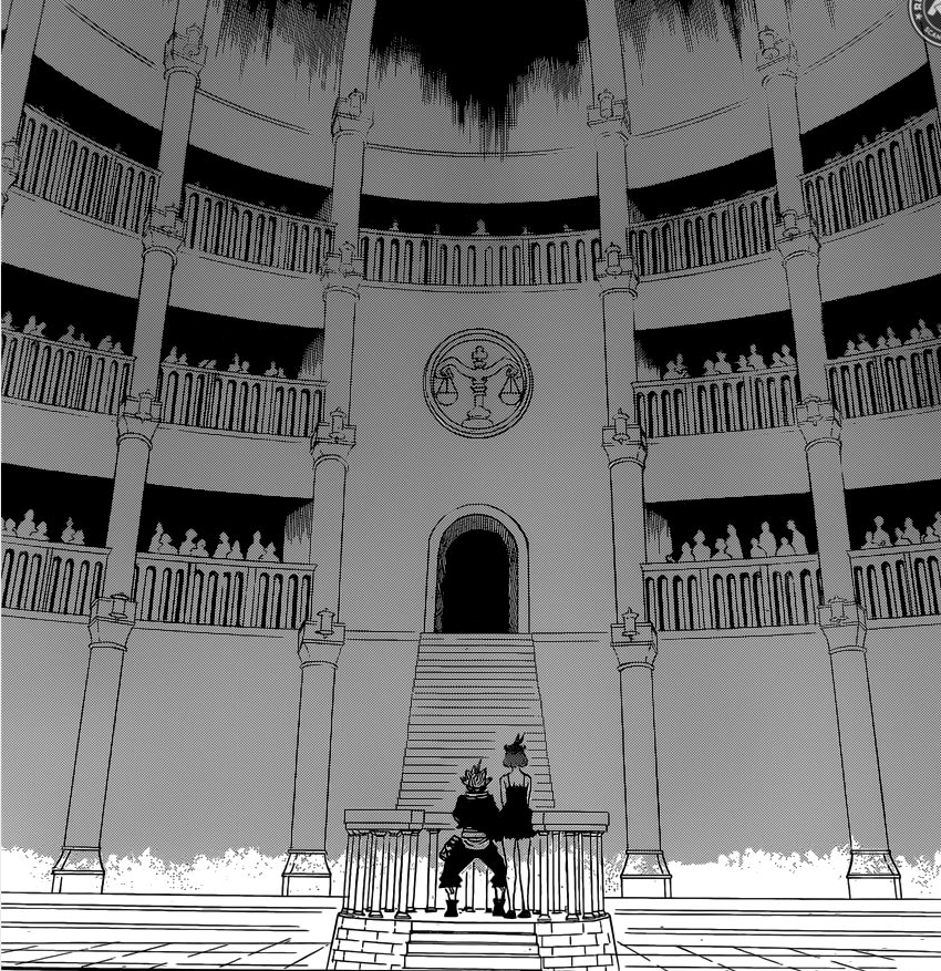 En el juzgado, Asta le dice al Parlamento que tiene el control total de su poder, pero el Parlamento no lo escucha y solo quiere que maten a Asta antes de que traiga un desastre al reino. Damnatio le dice a Asta que exceptúe su destino y le explica lo que sucedería si logra escapar. De repente, los Toros Negros irrumpen a través de la pared y comienzan a explicar qué tipo de persona es Asta y cómo lo llevarán de regreso. Damnatio le dice a los Toros Negros lo que le pasaría a su reputación si ayudan a Asta, a lo que Yami le informa que su escuadrón es lo peor de lo peor. Yami también dice que Asta y Secre son miembros de su escuadrón y que si planean hacerles daño, entonces tendrán que ir tras ellos. Secre les dice a los Toros Negros que la dejen y se lleven a Asta, a lo que los Toros Negros le dicen que ella también es miembro de los Toros Negros, mientras que Yami le pone una túnica a Secre. Damnatio explica a los Toros Negros cómo no pueden ayudar a Asta y Secre, y usa su magia para interrumpir los hechizos de los Toros Negros. Asta contrarresta el hechizo de Damnatio usando su magia para borrar el efecto del hechizo de Damnatio. Yami va a atacar a Damnatio, pero Nozel y Fuegoleon Vermillion aparecen de repente y bloquean el ataque de Yami.