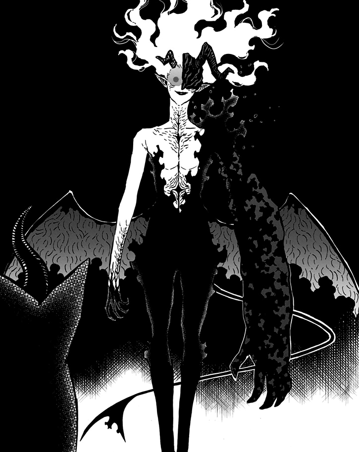 Tiene un cuerpo delgado con múltiples arrugas entre los pectorales y el centro del cuellos y en el abdomen, su cuerpo está cubierto con la materia oscura característica de los demonios que cubre de su cadera para abajo, parte del abdomen y los costados del torso, su característico brazo izquierdo está cubierto completamente de la materia oscura que incluso aumenta su tamaño y también está desprende múltiples partículas de su hombro, por el contrario su brazo derecho está completamente desnudo y su mano es de color negro con múltiples arrugas que cubren todo su antebrazo y al ser un demonio este posee un par de alas detrás de sus cintura y una cola con punta en forma de V afilada.