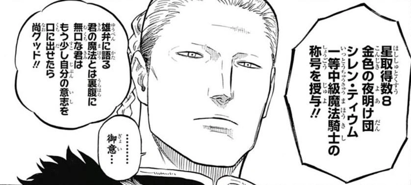 'Shren Tium' 「シレン・テイウム, Shiren Teiumu」 fue un noble y miembro del escuadrón de los Caballeros Mágicos, Amanecer Dorado del Reino del Trébol.