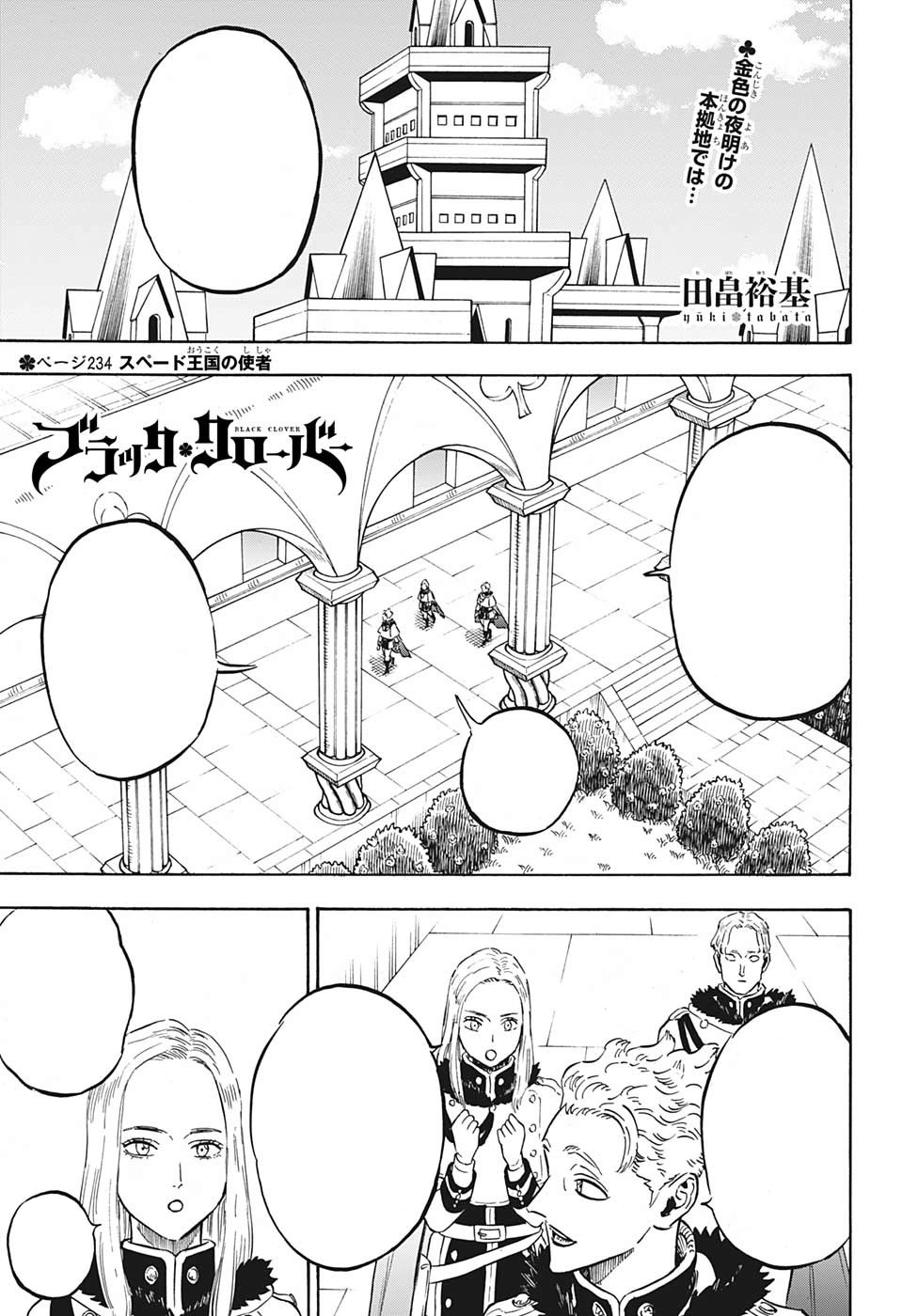O Mensageiro do Reino Spade 「スペード王国の使者 Supēdo Ōkoku no Shisha」 é a 234ª Página de Black Clover de Yūki Tabata.