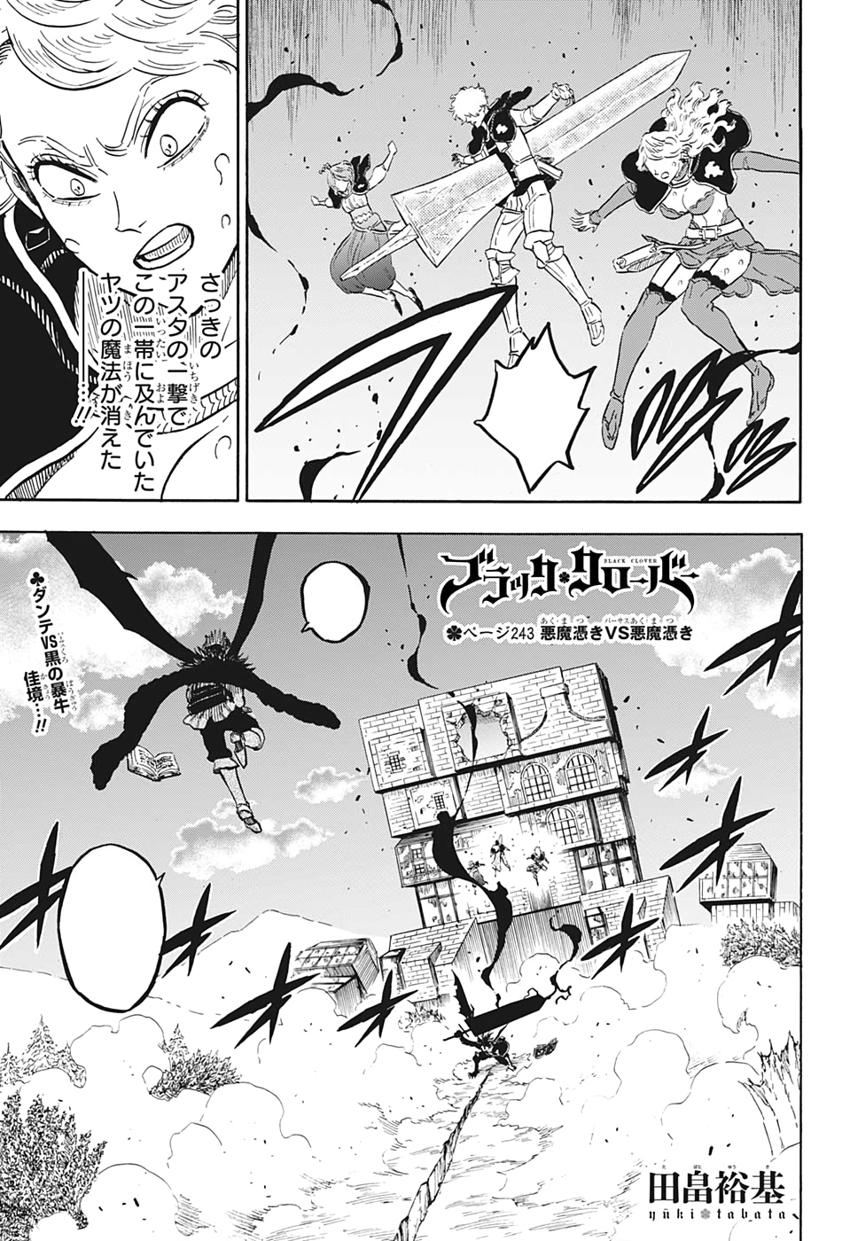 Dante diz que Asta é impressionante enquanto ele está nesse tipo de estado, e que ele terminará isso enquanto usa sua magia para transformar três pedaços da terra em espadas. Como Dante ataca com as espadas, Asta usa seu feitiço Furacão Negro para destruir as espadas. Dante vê isso e comenta sobre como Asta não está desistindo. Enquanto Asta lança outro corte negro em Dante, Dante diz que tudo o que Asta faz é inútil e usa sua magia para desviar do ataque. Asta consegue descobrir onde Dante está se esquivando e coloca uma ferida no rosto de Dante, que Dante pensa sobre como Asta imaginou onde ele estaria e comenta como Asta ousa marcá-lo.[4]