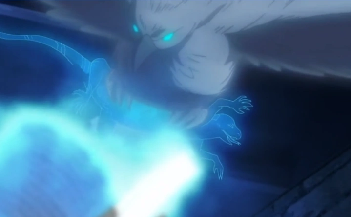 Com um grimório aberto, o usuário manifesta um pássaro tipo falcão composto de correntes de vento e com anatomia aviária completa, como asas e garras.