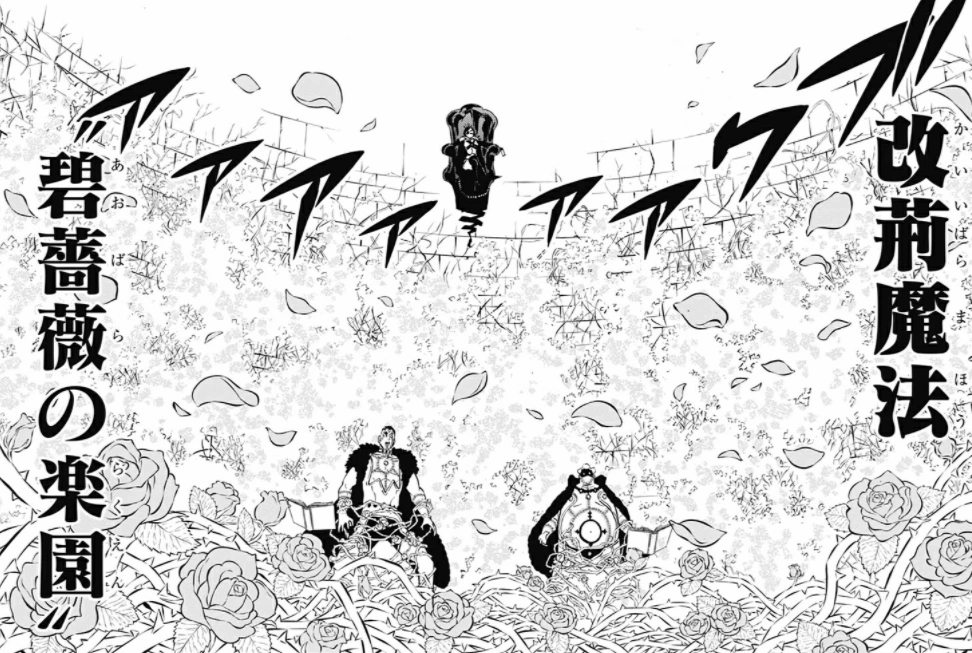 Magia de Roseira Modificada: Paraíso de Rosa Azul 「改荊魔法『碧薔薇の楽園』 Kai Ibara Mahō "Ao Bara no Rakuen"」 é um feitiço da Magia de Roseira modificada.