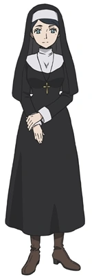 Лили носит монашеское одеяние и золотой крест на ожерелье из золотых бусин.