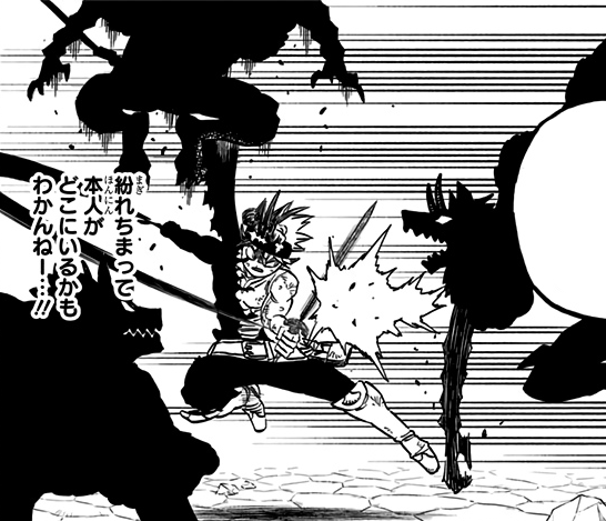Nacht then demonstrates how Unite Mode allows him to add his devils' characteristics to Shadow Magic. Gimodelo's characteristic is "Pack", and Nacht creates a horde of dog-like clones made of shadow. Nacht has the clones attack, and Asta struggles to block and dodge their attacks. Nacht tells Asta that the wolves will not disappear until he is defeated. As he cycles through his swords, Asta thinks about how his connection with Liebe is stronger, but Nacht points out that drawing out the power will not be easy for Asta since Liebe is not his servant. After grabbing Yami Sukehiro's katana, Asta says that he will surpass his limits, which irritates Nacht, disrupting his ki. Asta senses the disturbance and sends a flying Anti Magic slash, which cuts the edge of Nacht's cloak. Asta decides to name the katana, the Demon-Slasher Katana, and restates that he is going to surpass his limit. Nacht mentions that he hates that phrase.[2]