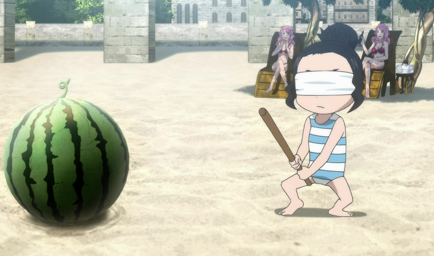 Before they head to the Seabed Temple on a mission to recover the magic stone, the Black Bulls play on Raque's beach. Charmy tries to strike a watermelon while blindfolded and listening to directions from Vanessa and Grey as Vanessa. Unfortunately she ends up striking Asta over the head instead.[32] The watermelon ends up on Asta's head and Charmy chases after him, stampeding over Sekke Bronzazza and his friends, before latching onto the watermelon still on Asta's head.[33] Yami appears and buries the squad up to their necks in the sand for having fun over the mission. He then briefs them about the mission to infiltrate the temple and the plan to access it during the full moon. The squad is surprised that the captain did actual work, for which he threatens them.[34]