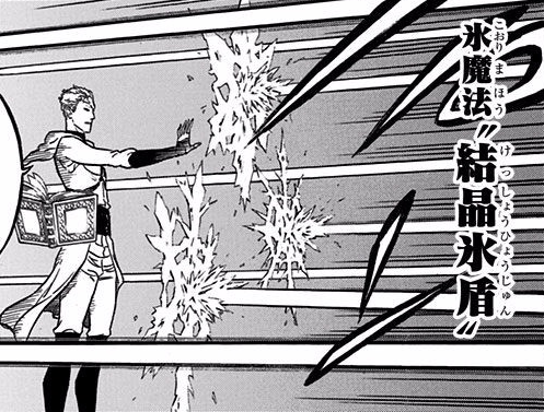 Ice Magic: Crystal Ice Shield 「氷魔法『結晶氷盾』 Kōri Mahō "Kesshō Hyōjun"」 is an Ice Magic spell.