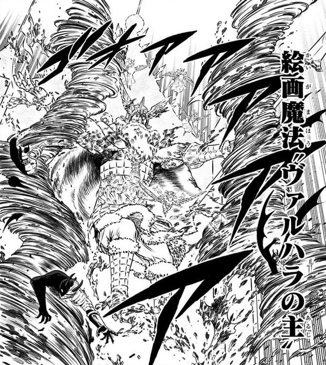 With an open grimoire, the user manifests a paint brush and a palette and, with a swipe of the brush, creates a giant, bearded man with a winged helmet, armor, and spear. Once created, the giant can raise his hands to summon multiple tornados, which capture and tear apart opponents.[1]